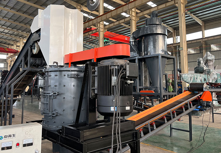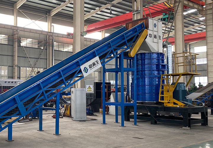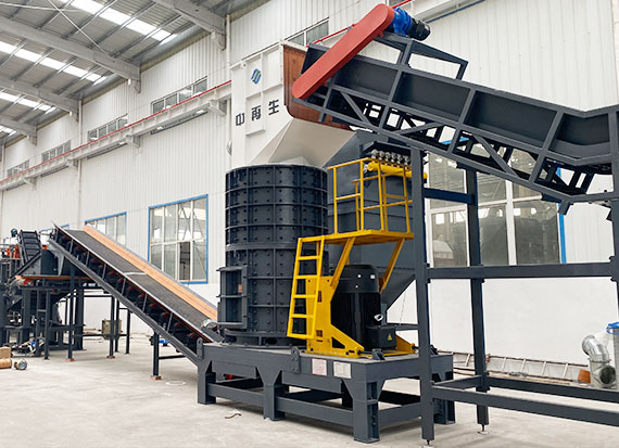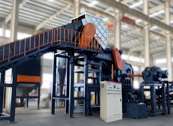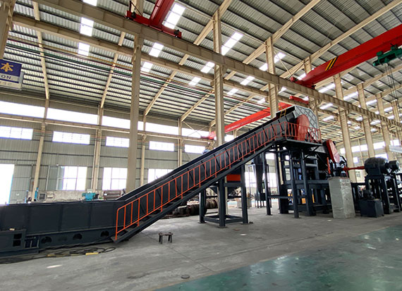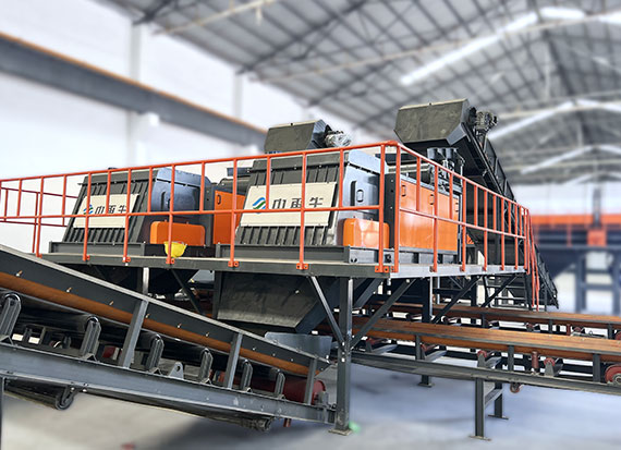 破碎線主機殼體采用特厚鋼板制造,內襯為高錳鑄鋼件,可更換;主機轉子盤安裝于水平軸上,轉子盤圓周分布有銷軸,軸向懸有錘頭;主軸用滾珠軸承支撐,循環(huán)油強制潤滑冷卻,并裝有溫度傳感器;進料口裝有液壓輥筒喂料裝置,位置一高一低,同向旋轉,能將大件松散物料壓扁,送入破碎腔內。