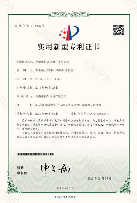• ZL2019216182510銅鋁水箱破碎用立式破碎機(jī)