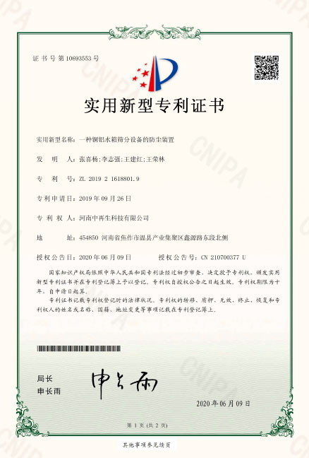 • ZL2019216457104.一種銅鋁水箱破碎用振動(dòng)篩分裝置