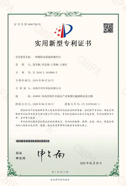 • ZL2019216188095.一種銅鋁水箱破碎操作臺(tái)